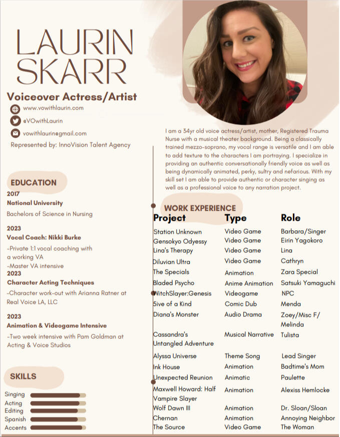 I am a Registered Trauma Nurse with a musical theater background. Being a classically trained mezzo-soprano, my vocal range is versatile and I am able to add texture to the characters I am portraying. I specialize in providing an authentic conversationally friendly voice as well as being dynamically animated, perky, sultry and nefarious.I am able to provide authentic or character singing. Being a Trauma Nurse, I am able to provide a professional voice to any medical narration projects.